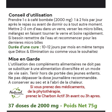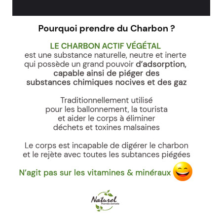 Moins de toxines c’est naturellement plus de santé et de vitalité. Malheureusement nous vivons dans un monde où la pollution est omniprésente (air, eau, alimentation, cosmétiques) (voir notre blog). Toutes ces substances sont nuisibles et notre corps doit les éliminer et il est possible de l’aider. Si vous avez subi une opération avec anesthésie, la prise de charbon permettra d’éliminer plus rapidement des substances résiduelles non utiles. Si vous partez à l’étranger le charbon de bois activé est salutaire pour les problèmes traditionnels de « turista ». De même lorsque vous sentez un dérèglement de votre transit (trop rapide, gastro), le charbon activé sera salutaire. De plus le Charbon de bois activé est connu pour adsorber les gaz. Il est donc très utile pour ceux qui ont des ballonnements et le ventre gonflé.