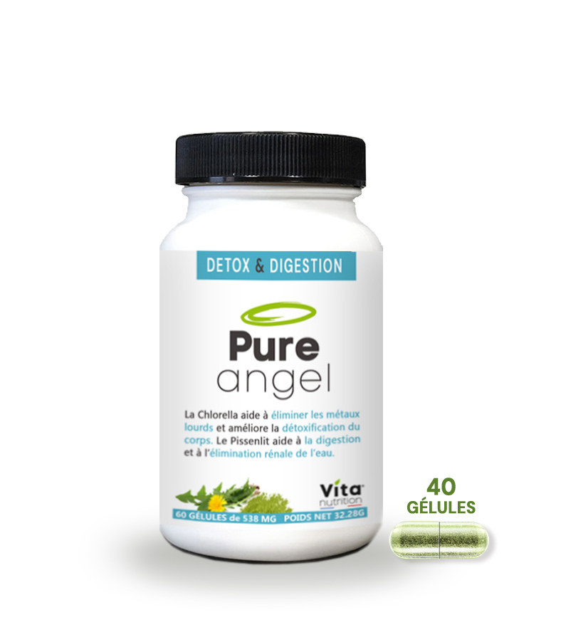 Pure Angel “lance” le signal au corps qu’il est temps de se débarrasser de ces substances. Pure Angel contient 12 extrait végétaux, plantes dépuratives, enzymes digestives, chlorella qui permet l'élimination des métaux lourds. Nous savons que la nature de notre microbiote joue un rôle majeur dans notre équilibre émotionnel, notre gestion de notre graisse corporelle, notre immunité, nos réactions inflammatoires...
