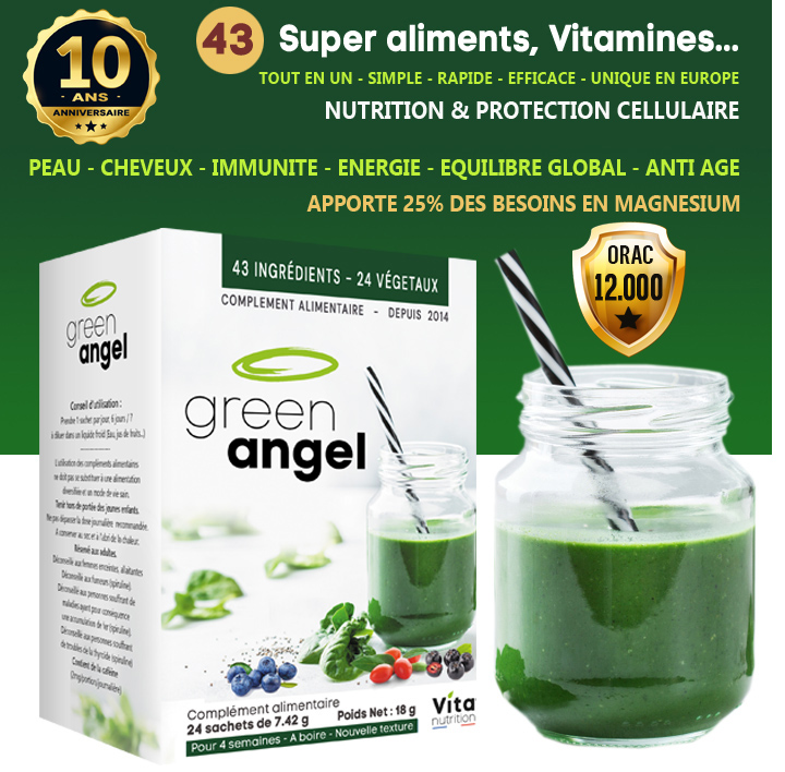 Oui, nous avons appelé notre produit aux 24 super aliments et aux 12.000 U ORAC/stick Angel car c’est un vrai ami, un véritable protecteur. Green…car il contient des super aliments et que la boisson qu’il donne est verte. Non seulement Green Angel est un puissant antioxydant mais il assure aussi un apport de 100% des principales vitamines et aussi de minéraux.